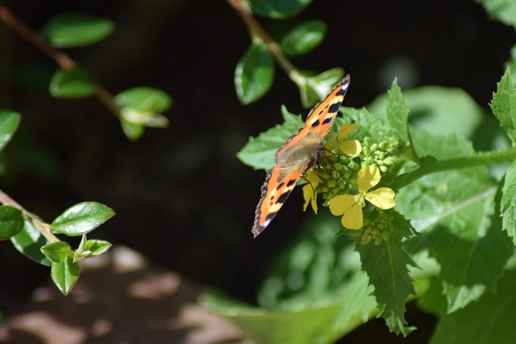 Nu kommer en Nældens Takvinge (Aglais urticae) forbi. Den distrahere mig lidt, og den sætter sig på den Ager-Sennep (Sinapis avensis), som jeg har ladet vokse i mit bed. Planten har været vært for en del insekter – ukrudt kan komme med glædelige overraskelser. Jeg ser videre i bedet, og jeg ser – igen – et problem, som jeg skal til at tage alvorligt. Mine rosers rødder er meget fritstående. Nogen har været lidt for grundige i deres insektjagt. Solsortungerne har fjernet jorden rundt omkring flere af bedets blomster. De har førsteret i min have, de bor der, jeg passer det bare. Skal de blive ved med at finde insekter, må jeg hellere være den store, og jeg skriver ny jord på min indkøbsliste. De skal vist også lige lære om ikke at overbruge af jordens ressourcer.