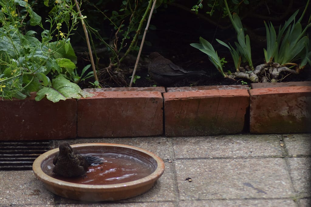 Nu er bedet samlet. Det er nu lidt større end ventet, så jeg ved ikke om det vil kunne flettes ind i mine planer. Regnen er tilbage igen, det er så hyggeligt i dette vejr. Bortset fra et skift af fuglebadets vand, har jeg ikke meget mere at ordne herude. Jeg sætter vand over. Mens vandet koger, ser jeg til tomaterne. De er virkelig blevet store og jeg glæder mig til at høsten begynder om en måneds tid. Hjemmedyrkede grøntsager smager så skønt! Jeg har fået luget lidt mellem dem, og jeg roser mig selv for, at jeg i sidste uge fik taget mig sammen og bundet dem op. Blæsten vi har haft de sidste på dage, ville have slået dem helt omkuld. Nu har vandet kogt færdigt. Jeg skolder fuglebadet og henter frisk koldt vand i bagefter. Nu er jeg færdig herude. Jeg sætter mig ind i vinduskarmen og ser ud på fuglene. Der går ikke længe, før de første er ved fuglebadet. Vinduet er åbent, og jeg sidder og lytter til vinden, fuglene der bader, og ser regnen komme og gå. Jeg elsker min lille oase i byen.